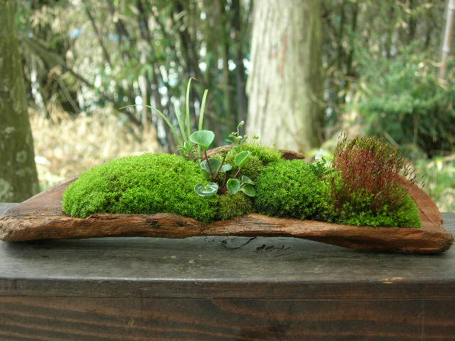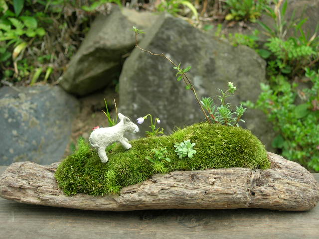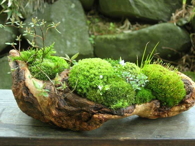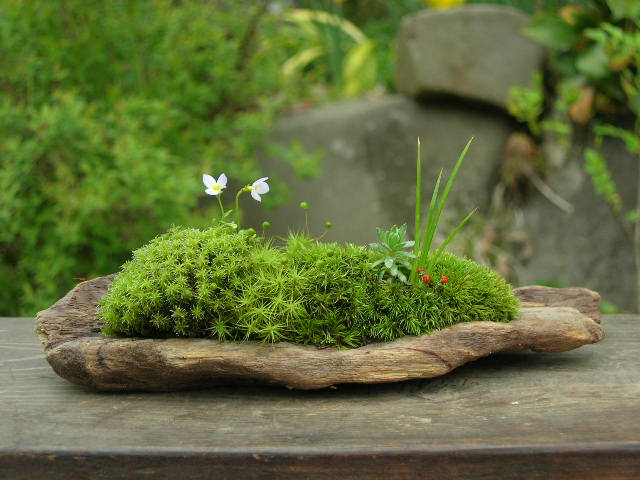 さまざまな苔、野草、流木、溶岩石などを使い